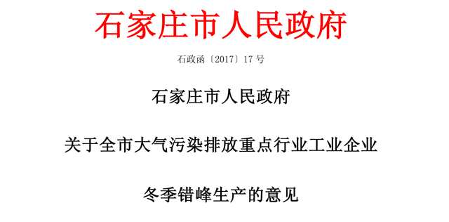 河北省石家庄市政府日前出台《关于全市大气污染物排放重点行业工业企业冬季错峰生产的意见》(以下简称《意见》)。