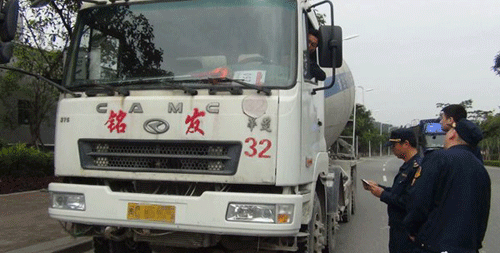 24日上午,晋江交通执法大队一中队在执行“雷霆治超”行动中重点检查水泥罐车。执法人员在建筑工地较多的双龙路段设点,对途经的水泥罐车一一排查,不放过任何一辆“吃人的老虎”,严查水泥罐车超限运输等违法违规行为,减少道路安全隐患问题。