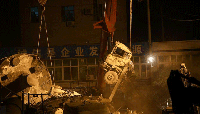 18:30,记者赶到天心区中意二路,在湖南建坤混凝土有限公司门前,数十台救援车辆正在倒塌现场进行紧张抢救,截至记者离开,未收到人员被救信息。