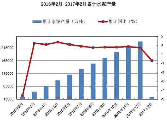 报告显示,2017年1-2月,全国水泥产量累计24007.9万吨,同比下降0.4%,降幅较去年同期收窄7.8个百分点。累计产量较去年同期下降133万吨。2017年1-2月份,全国固定资产投资增速略有回升;房地产开发企业投资增速明显回升,房屋施工面积和新开工面积增长势头较好,土地购置面积也由同比下降转为增长,房地产市场回暖迹象明显;基建投资高位增长。
