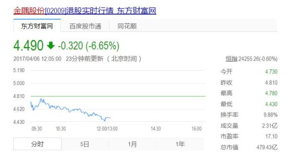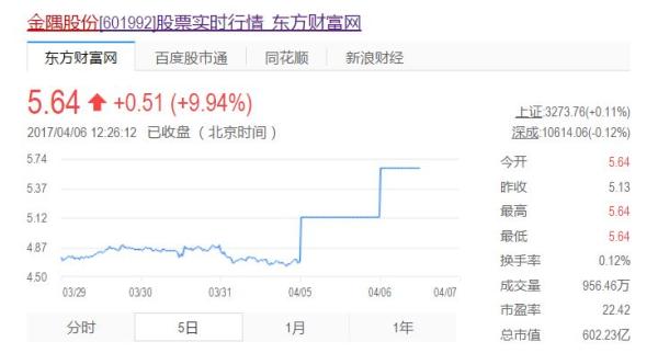 自4月1日雄安新区设立的消息发布以来,被称为雄安概念股的北京金隅股份有限公司(601992.SH,02009.HK)表现抢眼,A股延续连日涨停的态势,H股在短短两个交易日累计上涨49%,不过H股在今天开盘后出现下跌。截至发稿,金隅A股报5.64元/股,涨停;金隅H股报4.49港元/股,跌幅6.65%。