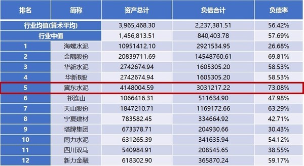 数据显示,冀东水泥2016年负债率为73.08%,远高于行业均值和行业中值(均值为56.42%,中值为57.69%)。