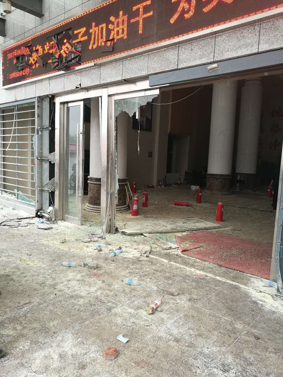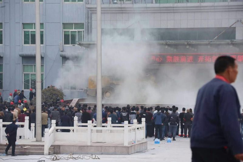 济南山水爆料,八日凌晨,袖缠红护身符布条、手戴白手套,600多人拿着棍棒聚集在济南104国道山东山水水泥集团有限公司总部门口,强行冲进大门,对办公楼的几个门进行“砸打”,还从厂区强行把装载机开上办公楼门口回廊对办公楼大门进行蛮击。此时,集团办公楼里山水高管和员工只有20余人,多人在防卫中被外边投掷的石块砸中受重伤,躺在医院。