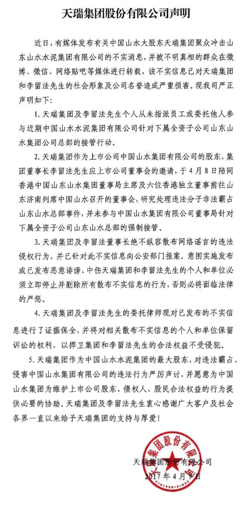 4月8日,天瑞集团派600多人袭击山水总部被水泥人网曝光之后,近40万的阅读量,进一步引爆了行业的关注。搜狐、网易、澎湃新闻、21世纪经济、央视、凤凰网纷纷进行了转载及相关持续报道。作为当事人之一的天瑞集团也在4月10日发表公告称“天瑞集团及李留法先生个人从未指派员工或委托他人参与近期中国山水水泥集团有限公司针对下属全资子公司山水山水集团公司总部的接管行动。”10日上午,天瑞集团发布声明予以否认,李留法先生是应上市公司董事会邀请,前往济南参加董事会,并强调“并未直接参与中国山水集团有限公司董事局针对下属全资子公司山东山水总部的强制接管”。公告内容如下:
