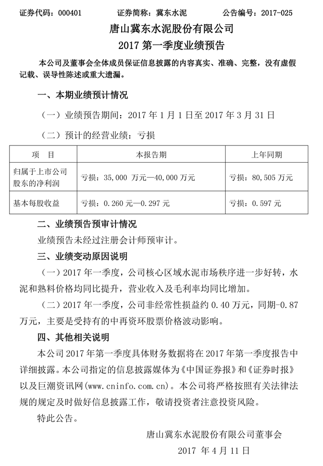 冀东水泥今日(4月12日)发布2017年一季度业绩预告,预计公司2017年1-3月净利润为-4.00亿元~-3.50亿元,上年同期为-8.05亿元,同比增长50.31%~56.52%。 公司表示,做出上述预测,是基于以下原因: (一)2017年一季度,公司核心区域水泥市场秩序进一步好转,水泥和熟料价格均同比提升,营业收入及毛利率均同比增加。 (二)2017年一季度,公司非经常性损益约0.40万元,同期-0.87万元,主要是受持有的中再资环股票价格波动影响 公告原文如下: