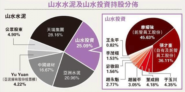 现时山水投资与亚泥现各持山水水泥25.09%及20.9%股权(见图),根据本报获得资料显示,亚泥曾与山水水泥前董事李茂桓、山水集团副总经理赵东平,以及罗夏信律师事务所的3名律师,两度召开员工大会,建议合共2631名员工以每股4.4元价格,将手中所持全部山水股份售予亚泥,收购价较山水水泥停牌前报价折让三成。若成事,亚泥将斥资37亿元。