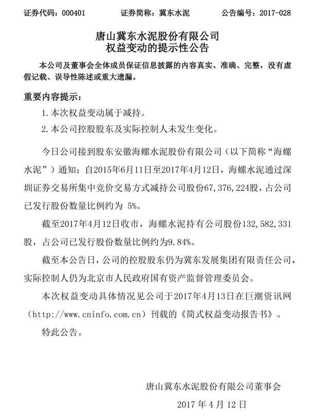 4月12日晚间,冀东水泥(000401)公告称,当日接到股东海螺水泥(600585)通知,自2015年6月11日至2017年4月12日,海螺水泥通过深圳证券交易所集中竞价交易方式减持公司股份67,376,224股,占公司已发行股份数量比例约5%。