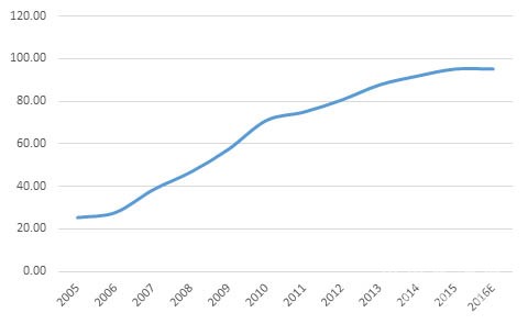 根据国家统计局数据,2015年窑外分解窑熟料产量达12.7亿吨,占熟料总产量的95.18%,预计2016年这一比重在95.2%左右,基本与2015年相当。虽然窑外分解窑工艺的熟料产量比重逐年提高,但是截止2016年仍有4.8%的熟料由非窑外分解窑生产。