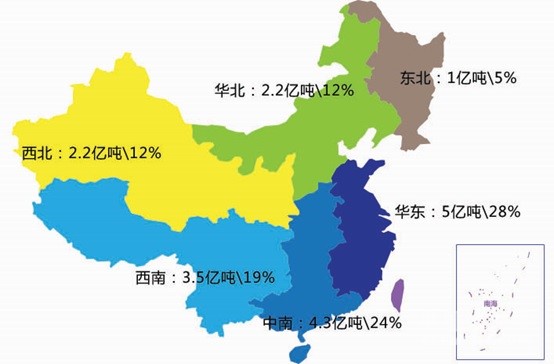 2016年底,全国新型干法熟料设计总产能达18.2亿吨(310天计算),北方、南方新型干法熟料产能占全国的比重分别为29.6%(5.4亿吨)和70.4%(12.8亿吨),其中华东、中南新型干法熟料产能占全国的比重分别为27.6%(5亿吨)和23.9%(4.3亿吨),西南地区占19%(3.5亿吨),西北、华北分别占12%(2.2亿吨),东北占5%(1亿吨)。