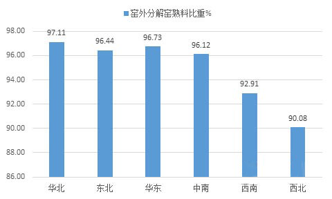 分区域来看,华北、东北、华东、中南四大区域窑外分解窑熟料产量占比均超过96%,西北及西南地区这比比例较其他区域则略低,分别为93%和90%,西北地区非窑外分解窑熟料产量的比重接近10%。