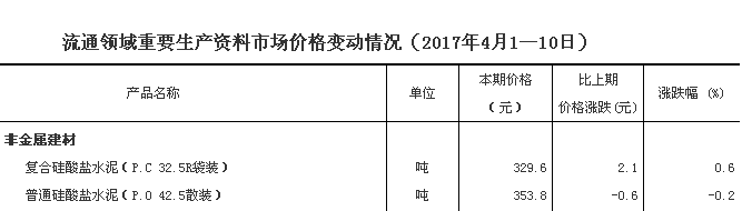 据对24个省(区、市)流通领域9大类50种重要生产资料市场价格的监测显示,2017年4月上旬,与3月下旬相比,20种产品价格上涨,22种下降,8种持平。其中非金属建材水泥产品本期价格有涨有降。其中复合硅酸盐水泥(P.C32.5R袋装水泥本期价格329.6元,同比价格上涨0.6个百分点;普通硅酸盐水泥(P.O 42.5散装水泥,本期价格353.8元,同比下跌0.2个百分点。