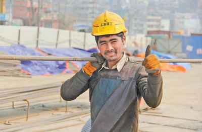 正在施工现场的尼泊尔建筑工人坦卡扛着钢筋,对记者竖起大拇指