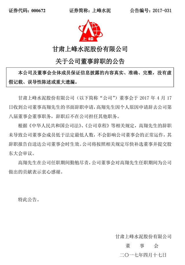 上峰水泥4月17日发布晚间公告称,董事会收到公司董事高翔先生的书面辞职申请,高翔先生因个人原因申请辞去公司第八届董事会董事职务,辞职后不在公司担任其他职务。