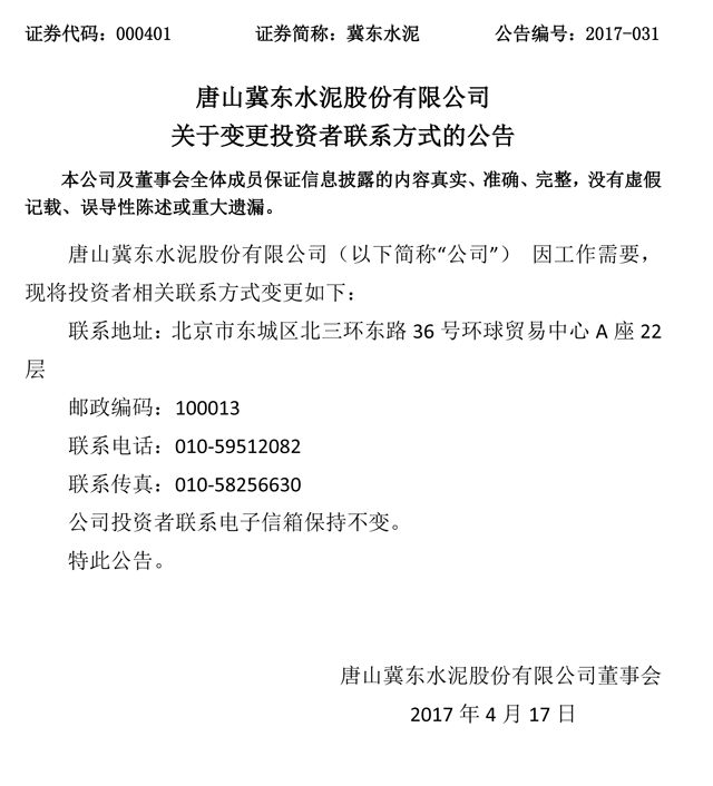 冀东水泥4月17日发布晚间公告称,因工作需要,变更投资者相关联系方式。公告原文如下: