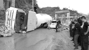 昨日(4月18日)下午3点钟左右,巫山龙门大桥往该县骡坪镇方向约300米处发发生一起惨烈车祸,一辆侧翻的水泥罐车将一辆宝马轿车的车头压扁,宝马车司机当场身亡,罐车司机受伤。