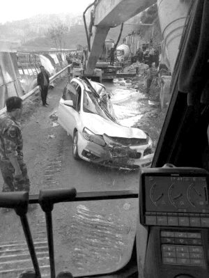 救援人员赶到现场后,破拆轿车后发现轿车变形严重,无法实施救援,于是有关部门又调来一辆吊车,将罐车吊起。