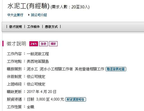 根据《中央社》报导,征人的业者李先生说,关岛当地有个大学的新建大楼工程需要工人,因此想从台湾招募工人过去,将应征有经验的水泥工20至30人。台湾的水泥师傅日薪约在2000~3000元,一个月约赚6至7万。