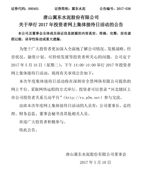 昨日(10日)晚间唐山冀东水泥股份有限公司发布关于举行2017年投资者网上集体接待日活动的公告称:为便于广大投资者更加深入全面地了解公司情况、发展战略、经营状况、融资计划、可持续发展等投资者所关心的问题,公司定于2017年5月16日(星期二),下午14:00-16:00举行2017年投资者网上集体接待日活动。