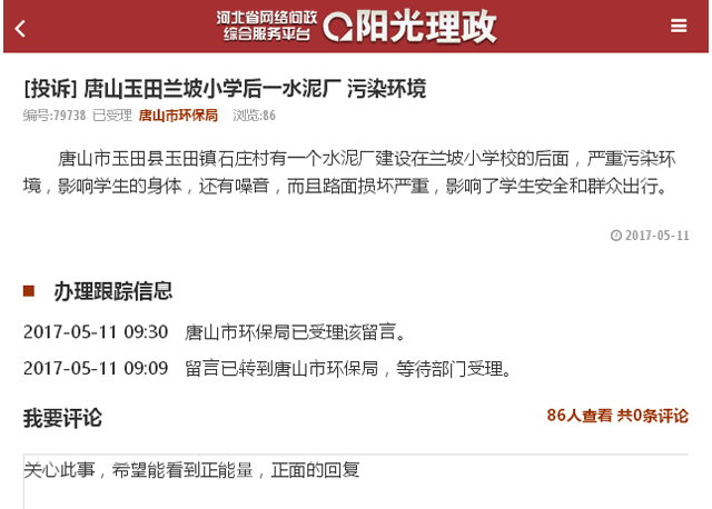 近日,河北省网络问政综合服务平台,阳光理政栏目接到投诉称唐唐山市玉田县玉田镇石庄村有一个水泥厂建设在兰坡小学校的后面,严重污染环境,影响学生的身体,还有噪音,而且路面损坏严重,影响了学生安全和群众出行。今日09:09该留言已转到唐山市环保局,09:30唐山市环保局已受理该留言。