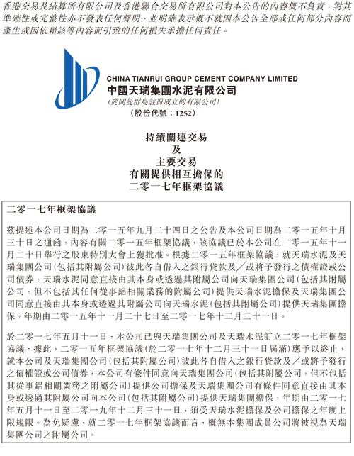 中国天瑞水泥(01252-HK)公告,于2017年5月11日,公司已与控股股东天瑞集团公司及公司附属天瑞水泥订立2017年框架协议,据此,2015年框架协议应予以终止。公司及天瑞集团公司(包括其附属公司)彼此各自借入的银行贷款、将予发行的债权证或公司债券,公司与天瑞集团公司同意相互提供担保,但公司不为天瑞集团公司从事铝相关业务的附属提供担保。年期由2017年5月11日至2019年12月31日。公司担保的每日结余上限为30亿元,天瑞集团担保的每日结余上限为70亿元。