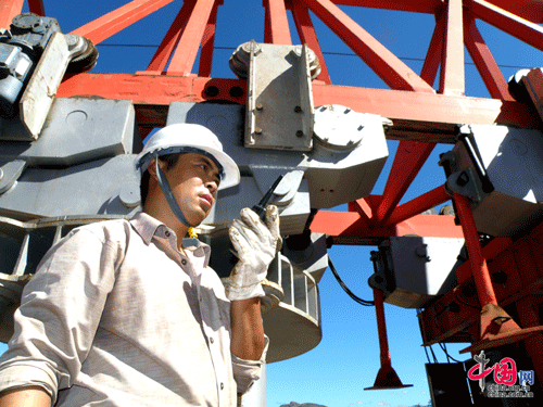 宽扎河特大桥施工现场,中国工人指挥大型架桥机操作