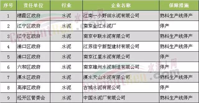 江苏发展大会环境空气质量保障重点管控水泥企业名单 保障措施中,熟料生产线停产企业共5家 1栖霞区:江南一小野田水泥有限公司 2 江宁区:南京中联水泥有限公司 3浦口区:江苏信宁新型建材有限公司 4溧水区:溧水天山水泥有限公司 5市开发区:中国水泥厂有限公司 被通知停产水泥企业共4家: 1 江宁区:南京金江水泥厂 2浦口区:南京江星水泥有限公司 3 六和区:南京雄州水泥制造有限公司 4高淳区:古城水泥有限公司 江苏发展大会环境空气质量保障重点管控 水泥熟料企业名单