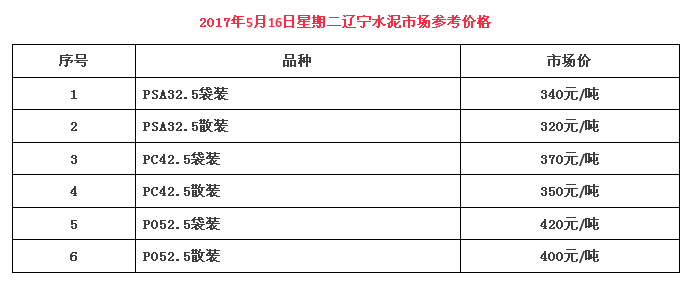 表:2017年5月16日星期二辽宁水泥市场参考价格