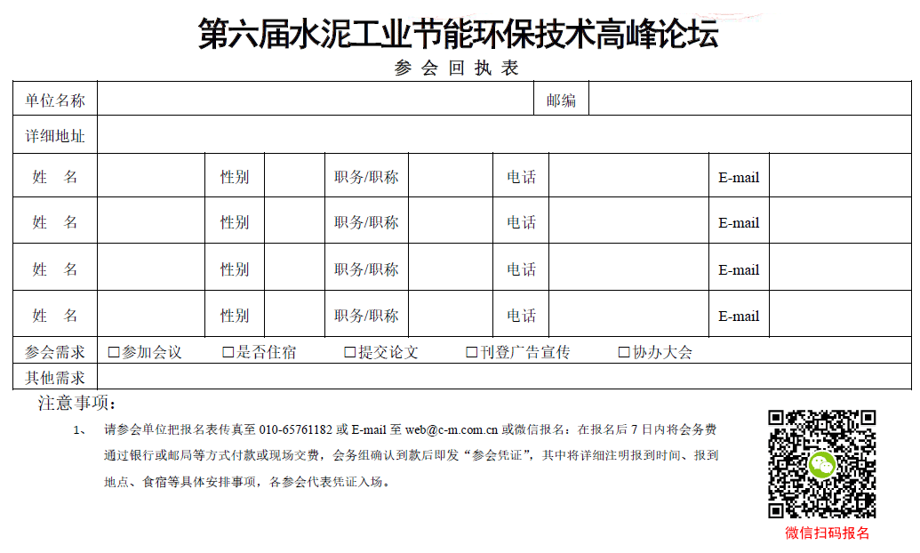 附:第六届水泥工业节能环保技术高峰论坛 参会回执表