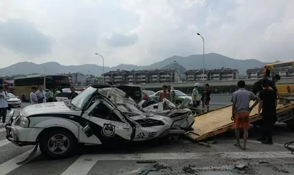 警车后半部几乎被压扁