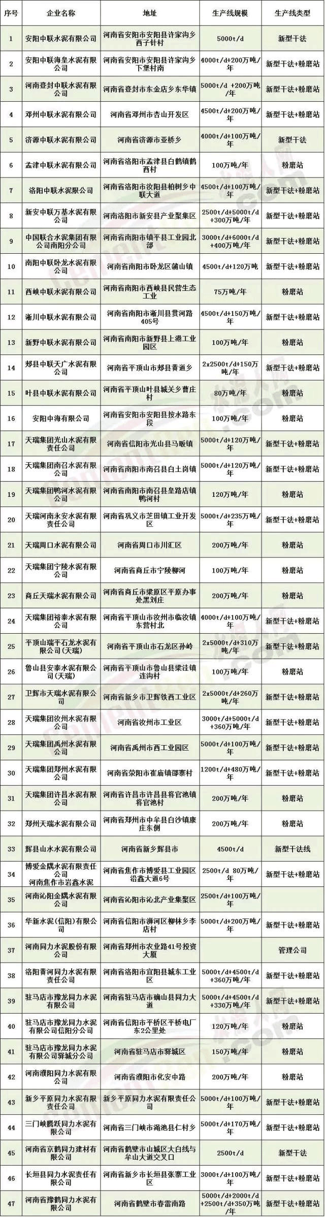 据相关数据统计河南省辖区内水泥企业有50余家,涉及前20强水泥龙头企业的熟料生产线40多条。其中包括中国联合水泥14条熟料生产线,天瑞集团12条水泥熟料生产线以及同力水泥的11条水泥熟料生产线,也包括华新水泥、山水水泥、金隅水泥等水泥龙头企业的水泥熟料生产线。