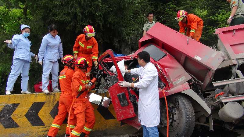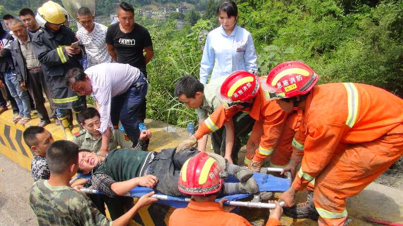 13时30分,吊车从城区赶到现场开展起吊作业,为了保证起吊时平稳可靠,不对被困人员造成二次伤害,救援官兵负责保护。“起吊!”,随着现场指挥员的一声令下,货车车顶被成功吊起。随后救援官兵利用液压扩张器,钻入副驾驶室一侧,在车内的夹缝中实施扩张救援。15分钟后,被困人员的被卡部位开始松动,救援人员立即将被困人员从车内一个一个抬出,并抬上担架送上救护车紧急送往医院进行救治。