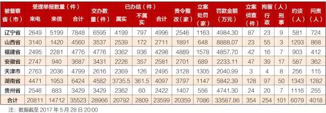 截至2017年5月28日20:00,共计受理举报35523个(其中,来电举报20811个,来信举报14712个);经梳理分析并合并重复举报,累计向被督察地方交办有效举报28966件。地方已办结23599件,责令整改20359家,立案处罚7086家,共计罚款33587.86万元;立案侦查354件,行政和刑事拘留355人,约谈6079人,问责4018人(具体情况详见附表)。