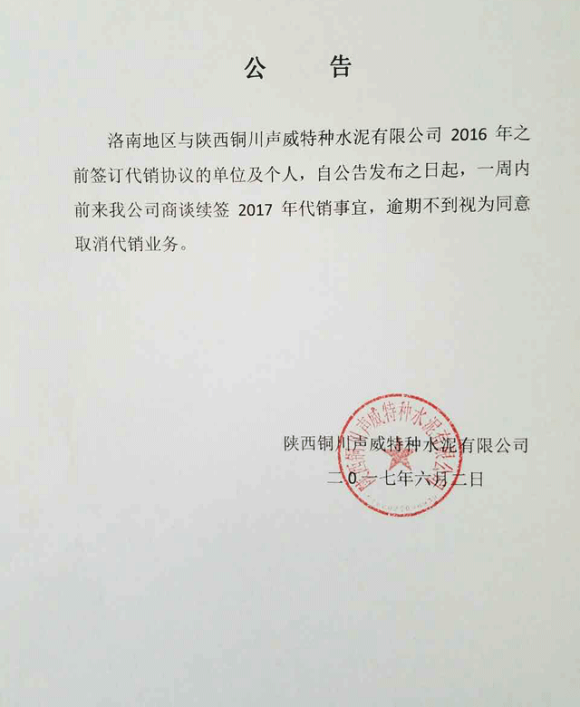 洛南地区与陕西铜川声威特种水泥有限公司2016年之前签订代销协议的单位及个人,自公告发布之日起,一周内前来我公司商谈续签2017年代销事宜,逾期不到视为同意取消代销业务。