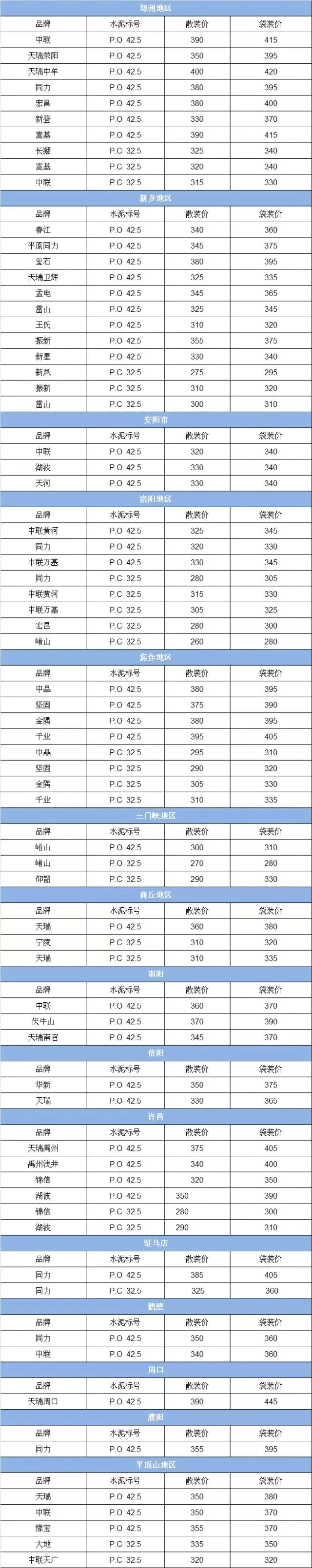 附: 河南省区域水泥市场近期价格一览