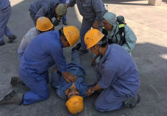 熟料分厂厂长宋杰明担任本次应急救援演练总指挥,并由救护组、抢险组、警戒组、现场清理组和后勤保障组构成演练框架。演练模拟一名职工巡检时发现6#氨水罐区因发生氨水泄漏导致一人晕倒在地。因情况未明,立即用对讲机向生产值班长报告,接到报告后,值班长迅速赶往事故现场,由于氨水气味较浓,无法近距离查看,初步判断为现场发生氨水泄漏。并立即向分厂汇报:宋厂长,6#氨水罐区发生氨水泄漏,有一名员工晕倒,因气味较浓,无法进入施救,请指示。宋厂长接到报告后,一边赶往事故现场,一边通知分厂安全员迅速启动应急预案组织实施紧急救援。接到通知的各应急小组快速在6#窑三档东侧集合,并在总指挥的统一调度指挥下迅速展开人员疏散、抢救伤员、现场警戒、堵漏抢险、消防救援等应急措施。整个演练过程紧张有序,各小组行动迅速,对问题处理果断。最后,现场清理组组长白海兵向总指挥报告:总指挥,已对泄漏氨水进行了回收,地面残留氨水已用消防水进行了稀释中和处置,隐患已消除,请指示。总指挥:返回原地待命。总指挥接到各小组组长完成救援报告后,命令各小组组长清点各自人数。至此,本次应急救援任务圆满完成。