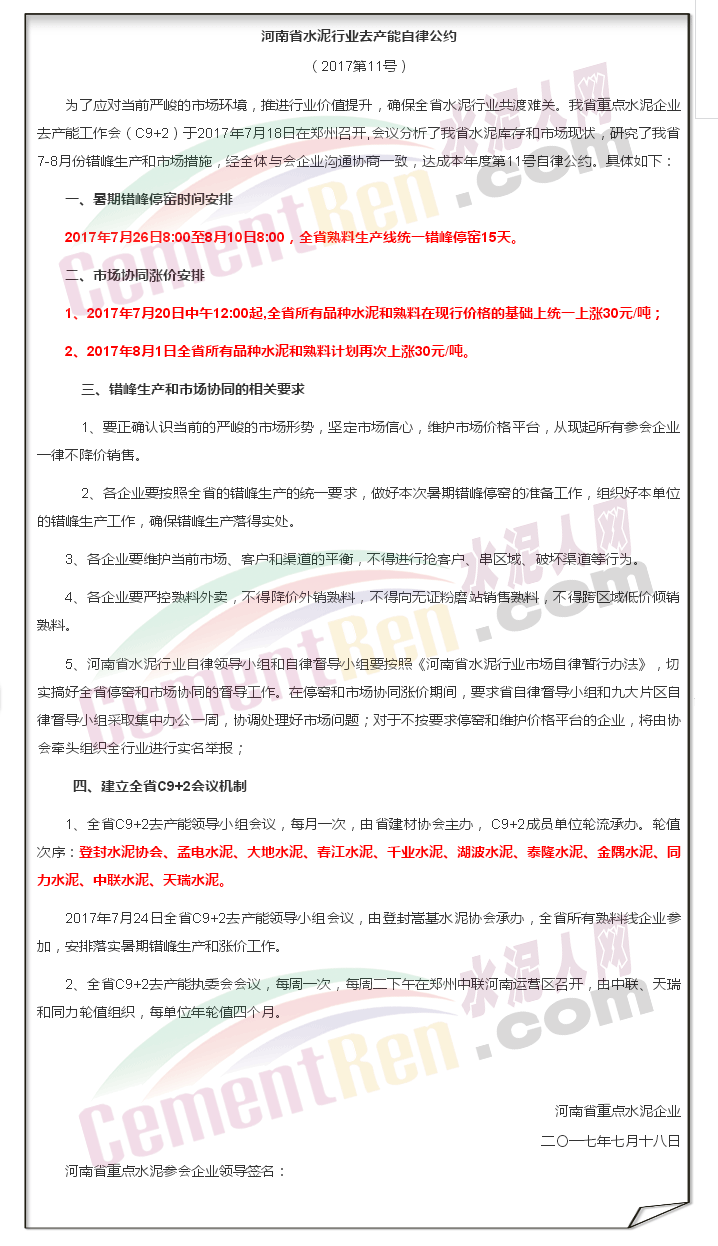 “自律公约”要求河南全省熟料生产线2017年7月26日8:00至8月10日8:00,统一错峰停窑15天;2017年7月20日中午12:00起,全省所有品种水泥和熟料在现行价格的基础上统一上涨30元/吨;2017年8月1日全省所有品种水泥和熟料计划再次上涨30元/吨。