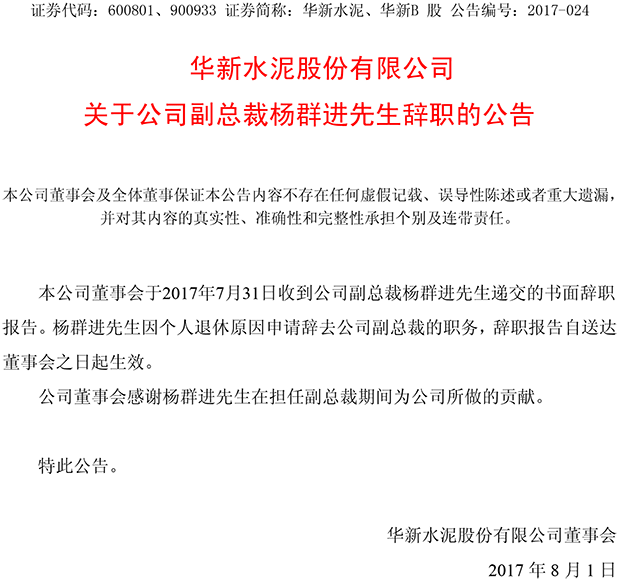 7月31日晚间,华新水泥发布公告称,公司董事会于2017年7月31日收到公司副总裁杨群进先生递交的书面辞职报告。杨群进先生因个人退休原因申请辞去公司副总裁的职务,辞职报告自送达董事会之日起生效。