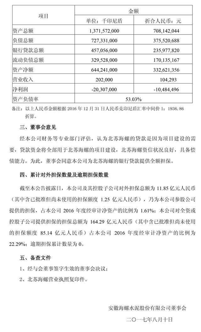 为支持北苏海螺的项目建设,公司董事会于2017年8月8日批准了关于公司为北苏海螺银行贷款提供担保的议案,担保金额为9000万美元,担保期限为1年,公司此次为北苏海螺提供担保的方式为连带责任保证。