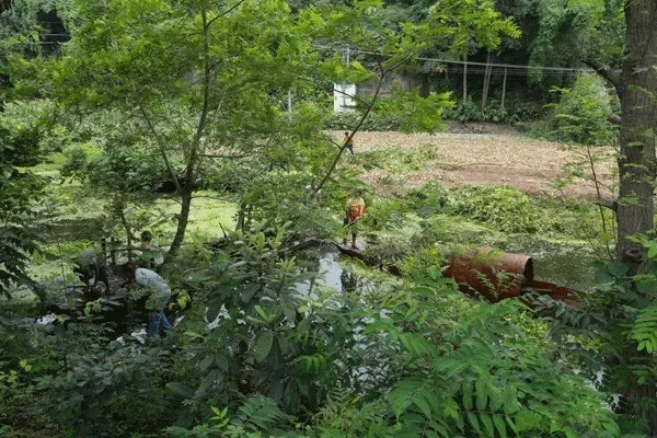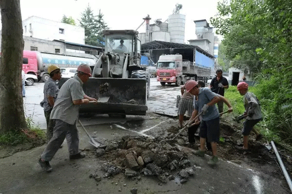 8月11日上午,记者在宇基水泥厂看到,工厂已全面停产,在厂区水泥排料口已进行密封处理;在厂房河道附近,工人们正在紧张建设水槽、沉砂池、限流井,以保证废水过滤处理;河道上,工人们正在进行打捞水葫芦和捞淤整治。