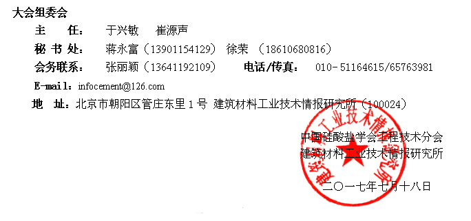 会议将同期出版发行会议论文集,欢迎踊跃投稿。提交论文格式为WORD文档格式, 征文截止日期为2017年9月5日,论文经专家评审遴选后收入大会论文集,论文接收邮箱infocement@126.com。