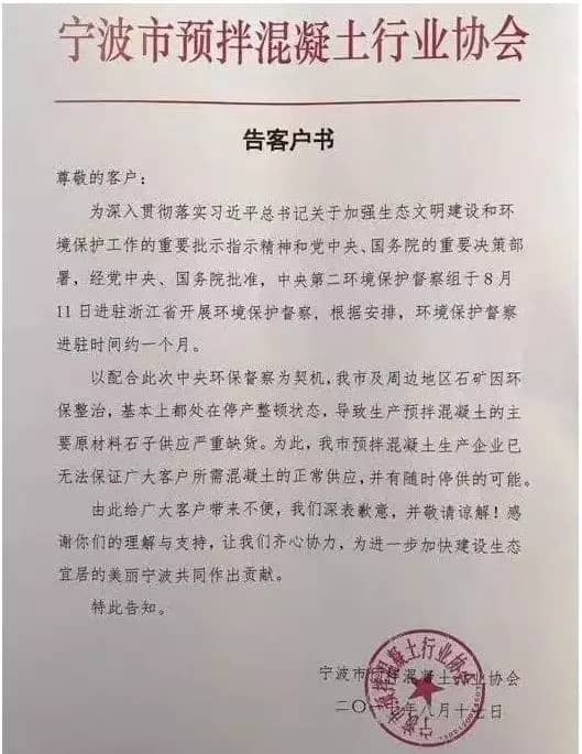 而就在环保督察组进驻一周的时间,宁波市预拌混凝土行业协会发布《发客户书》,称为配合环保督查为契机,宁波市及周边地区石矿因环保整治,基本都处于停产整顿状态,导致生产预拌混凝土的主要原材料石子供应严重缺货。为此,宁波市预拌混凝土生产企业无法保证混凝土的正常供应,并有随时停供的可能!