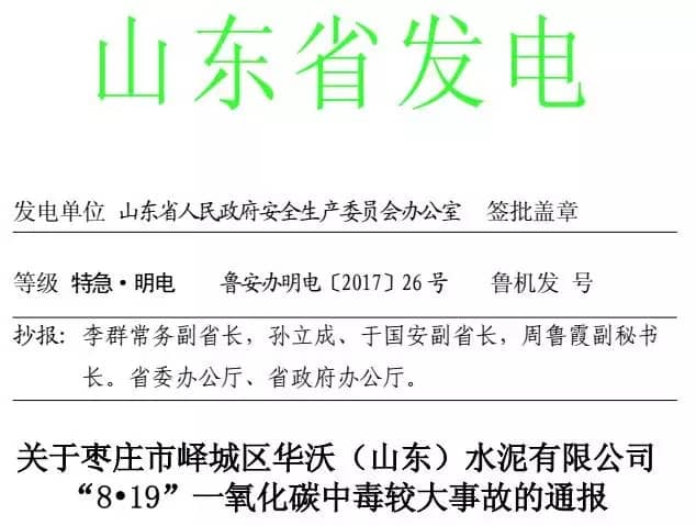 2017 年 8 月 19 日 9 时许,枣庄市峄城区华沃(山东)水泥有限公司发生一起一氧化碳中毒较大事故,共造成 5 人死亡。