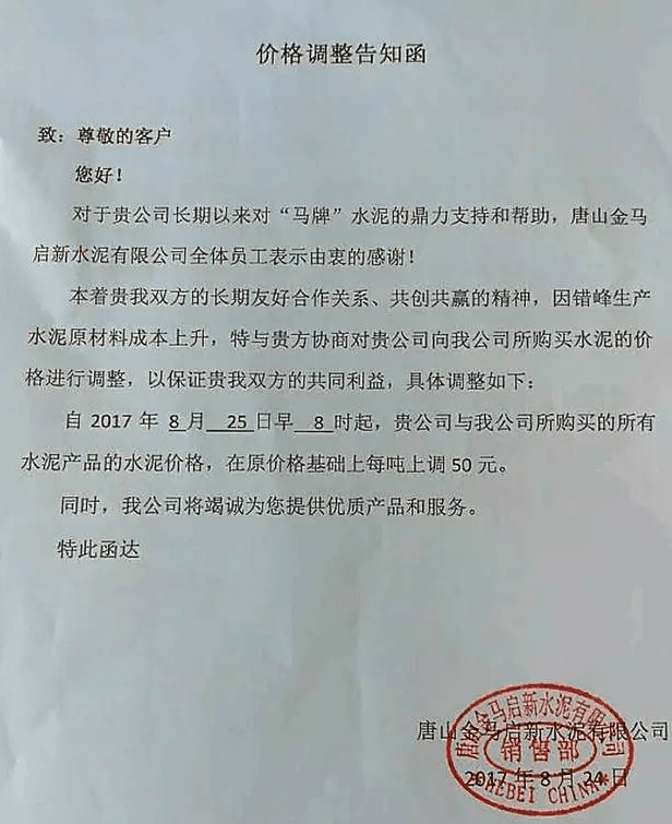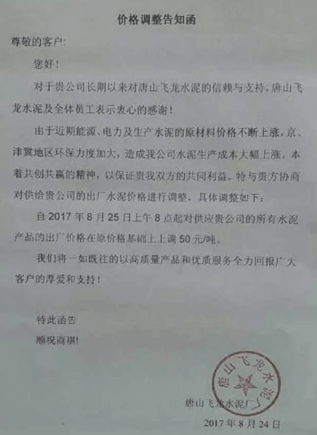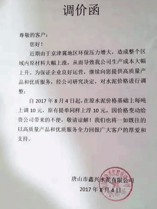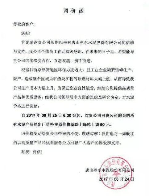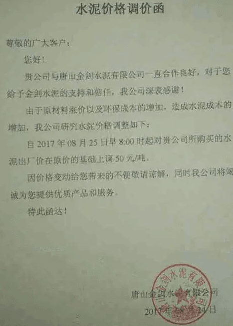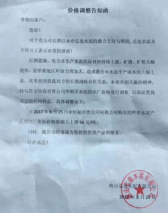 月初水泥人网曾发布河北省建筑业协会下发《关于河北省水泥行业去产能实施错锋生产的预通知》的消息,通知文件要求河北省内水泥熟料企业于8月8月0时至8月17日24时实施停窑限产10天。随后部分企业便发布了调价函。调价函内容与本调价内容相似。上调价格幅度在10元~30元不等。8月10日左右沧州地区也跟涨30元/吨。