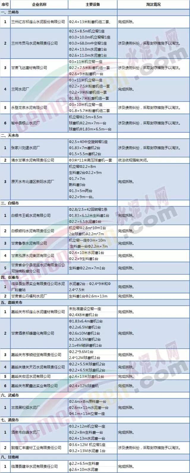 甘肃省水泥落后产能淘汰完成情况表