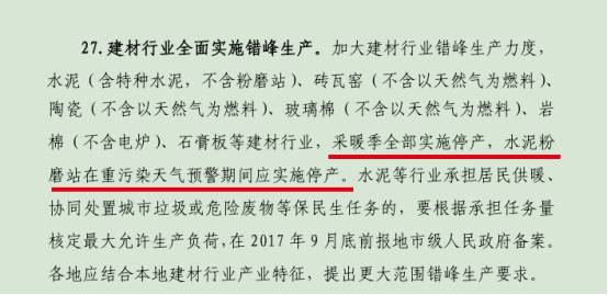 【水泥人网】近日,环保部发布《京津冀及周边地区2017-2018 年秋冬季大气污染综合治理攻坚行动方案》,2017年10月至2018年3月,水泥(含特种水泥,不含粉磨站)、砖瓦窑(不含以天然气为燃料)、陶瓷(不含以天然气为燃料)、玻璃棉(不含以天然气为燃料)、岩棉(不含电炉)、石膏板等建材行业,采暖季全部实施停产,水泥粉磨站在重污染天气预警期间应实施停产。