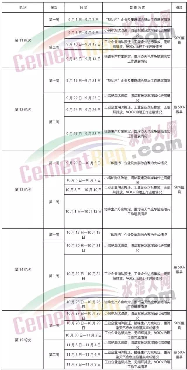 第一阶段(2017 年 9 月 1 日至 11 月 9 日),共 5 个轮次(第 11至 15 轮次)70 天,重点对“2+26”城市所有县(区)全部 12 项任务完成情况、各项减排措施的落实情况、任务清单外的涉气类突出问题以及《攻坚方案》中“2+26”城市的其他大气污染综合治理任务进行督查(具体安排见附 2)。