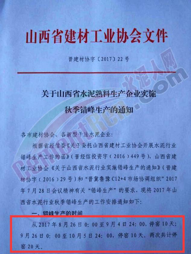 除此之外,据水泥人网了解,京津冀部分地区自7、8月份起已经在执行区域错峰生产。如山西地区自8月26至9月4日,停窑10天;9月26日至10月5日,停窑10天,紧接着11月份起执行采暖季全面停产。而河北地区,因十九大召开,计划10月份自律停产10天左右,11月份起执行采暖季全面停产。