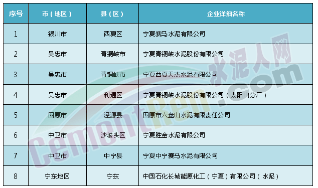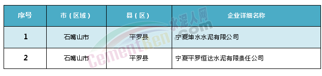 以上表格数据显示宁夏自治区2017年国控重点污染源水泥企业共8家,包括宁夏赛马水泥有限公司两家企业;2017年宁夏区控重点污染源企业包括2家水泥企业分别为宁夏坤水水泥有限公司和宁夏平罗恒达水泥有限责任公司。