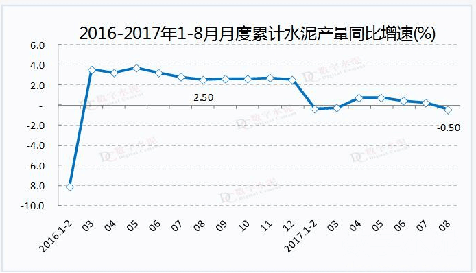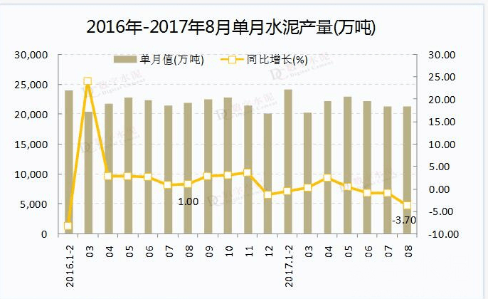 今年多数地区开始实施水泥夏季错峰生产,加上环保督察力度不断加大,水泥市场需求受到影响,8月份,全国单月水泥产量与上月相比降幅较小,但同比下降明显;前8个月全国累计水泥产量同比呈现出负增长,但降幅不大。