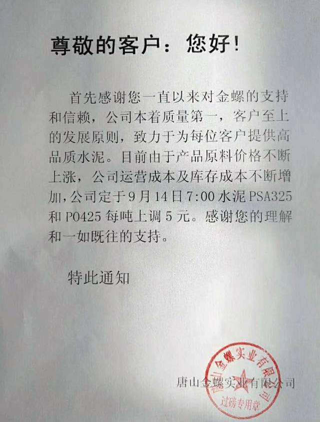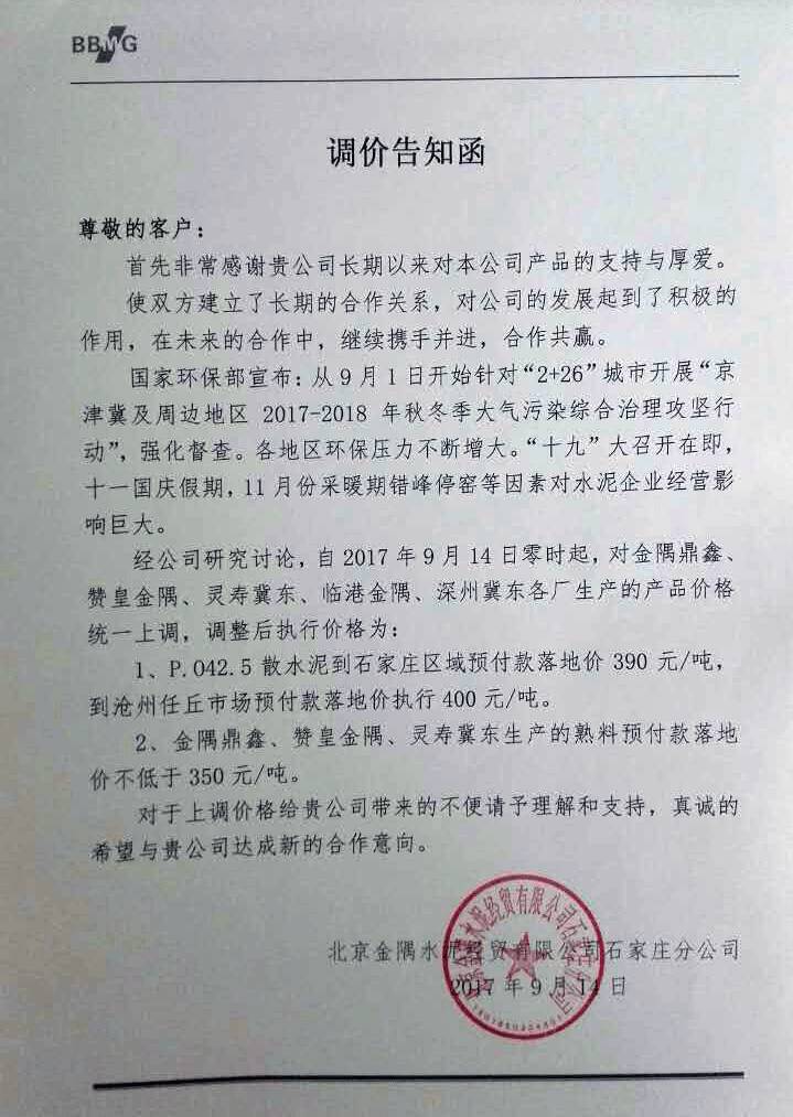 北京金隅水泥经贸有限公司石家庄分公司调价告知函原文如下: